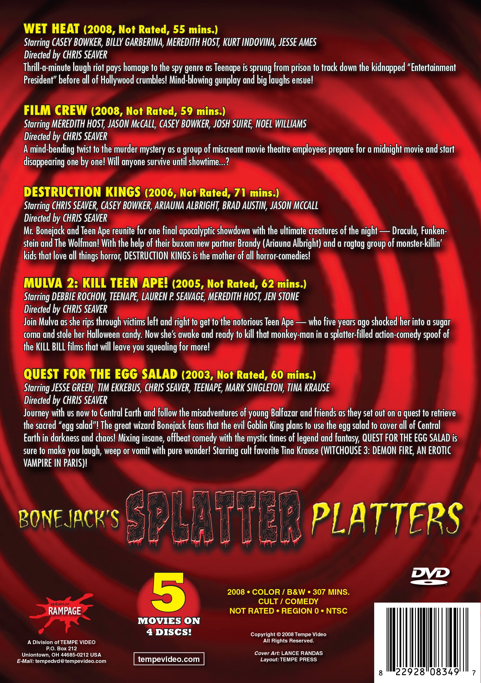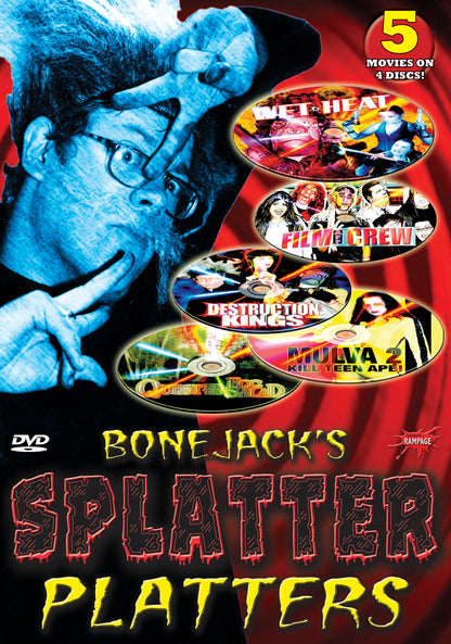 Splatter Rampage gathers together some of Chris Seaver’s most notorious splatter comedies with BONEJACK’S SPLATTER PLATTERS 5-Pack! In addition to the all-new 2008 release FILM CREW & WET HEAT Double Feature, fans will be treated to DESTRUCTION KINGS (2006), MULVA 2: KILL TEEN APE! (2005) and QUEST FOR THE EGG SALAD (2003)!