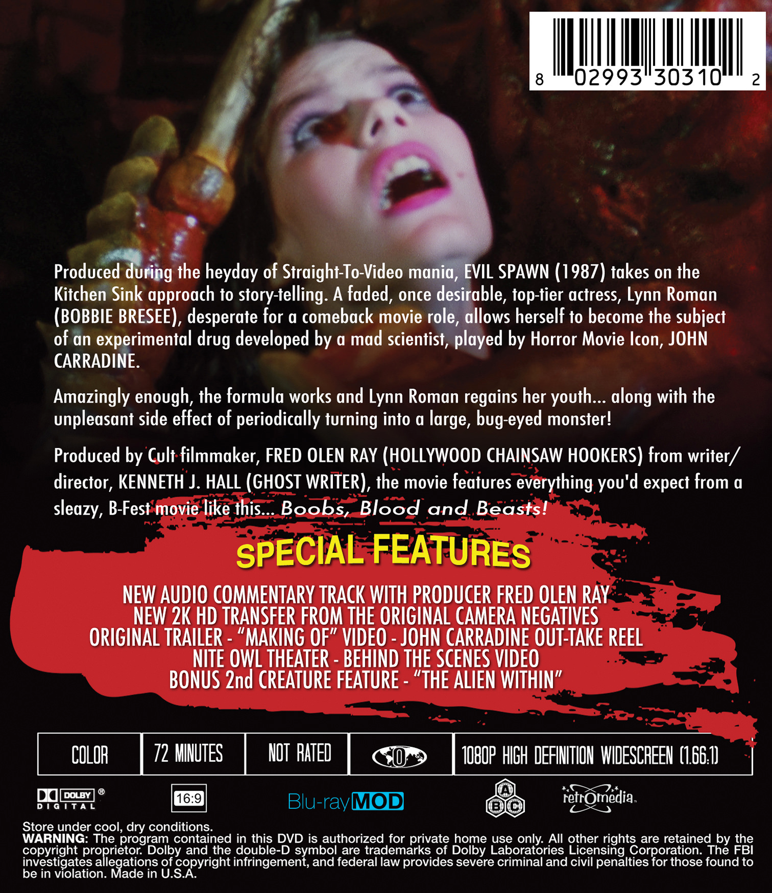 Produced during the heyday of Straight-To-Video mania, "Evil Spawn" (1987) takes on the Kitchen Sink approach to story-telling. A faded, once desirable, top-tier actress, Lynn Roman (Bobbie Bresee), desperate for a comeback movie role, allows herself to become the subject of an experimental drug developed by a mad scientist, played by Horror Movie Icon, John Carradine.