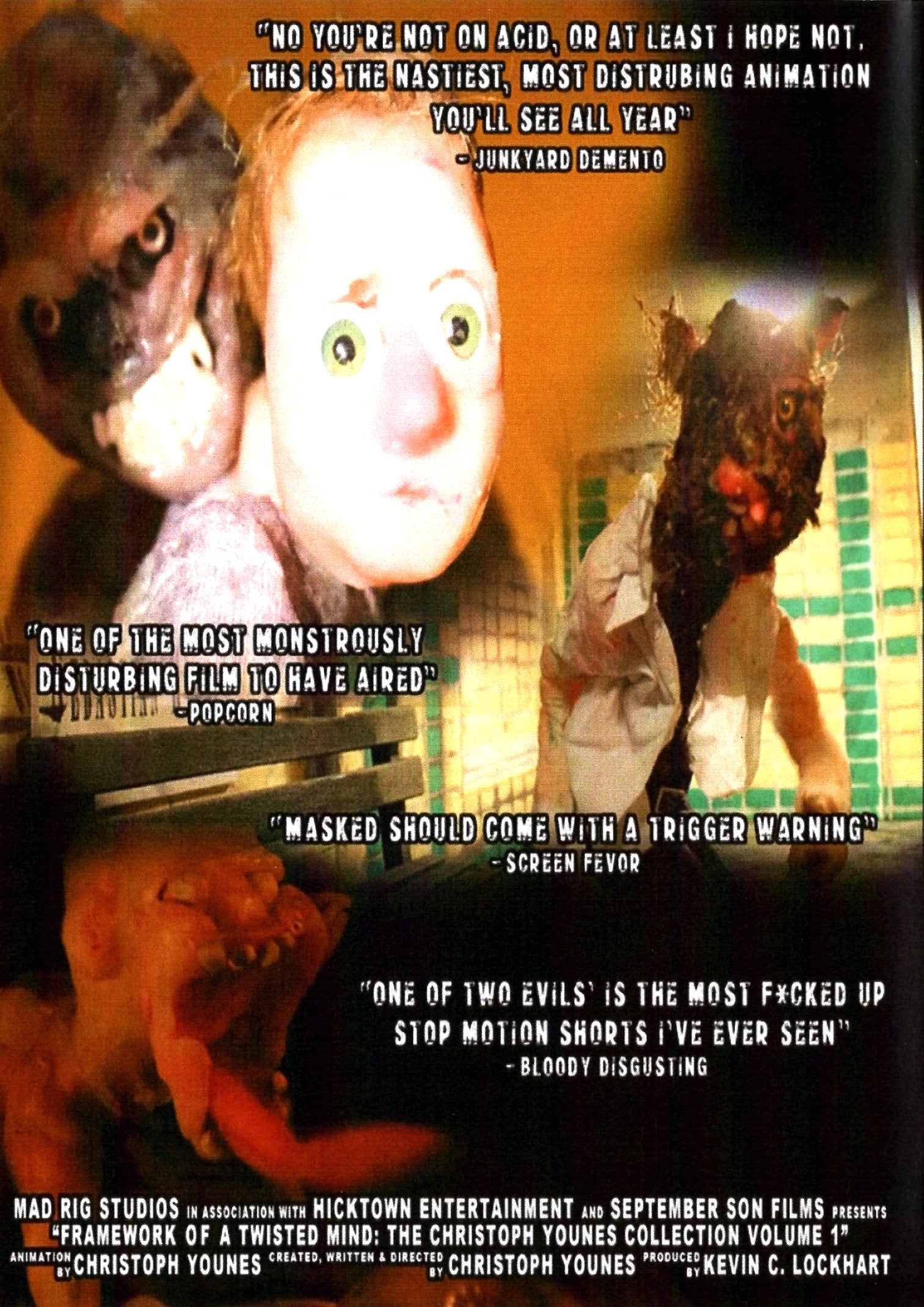 From the warped mind of writer/director/stop-motion animator extraordinaire Christoph Younes comes a DVD uniting his earliest creations with more recent nightmares. These films have been described as nasty, monstrously disturbing, uncomfortable and f#@ked up — not for the faint of heart! You will never look at stop-motion animation the same.