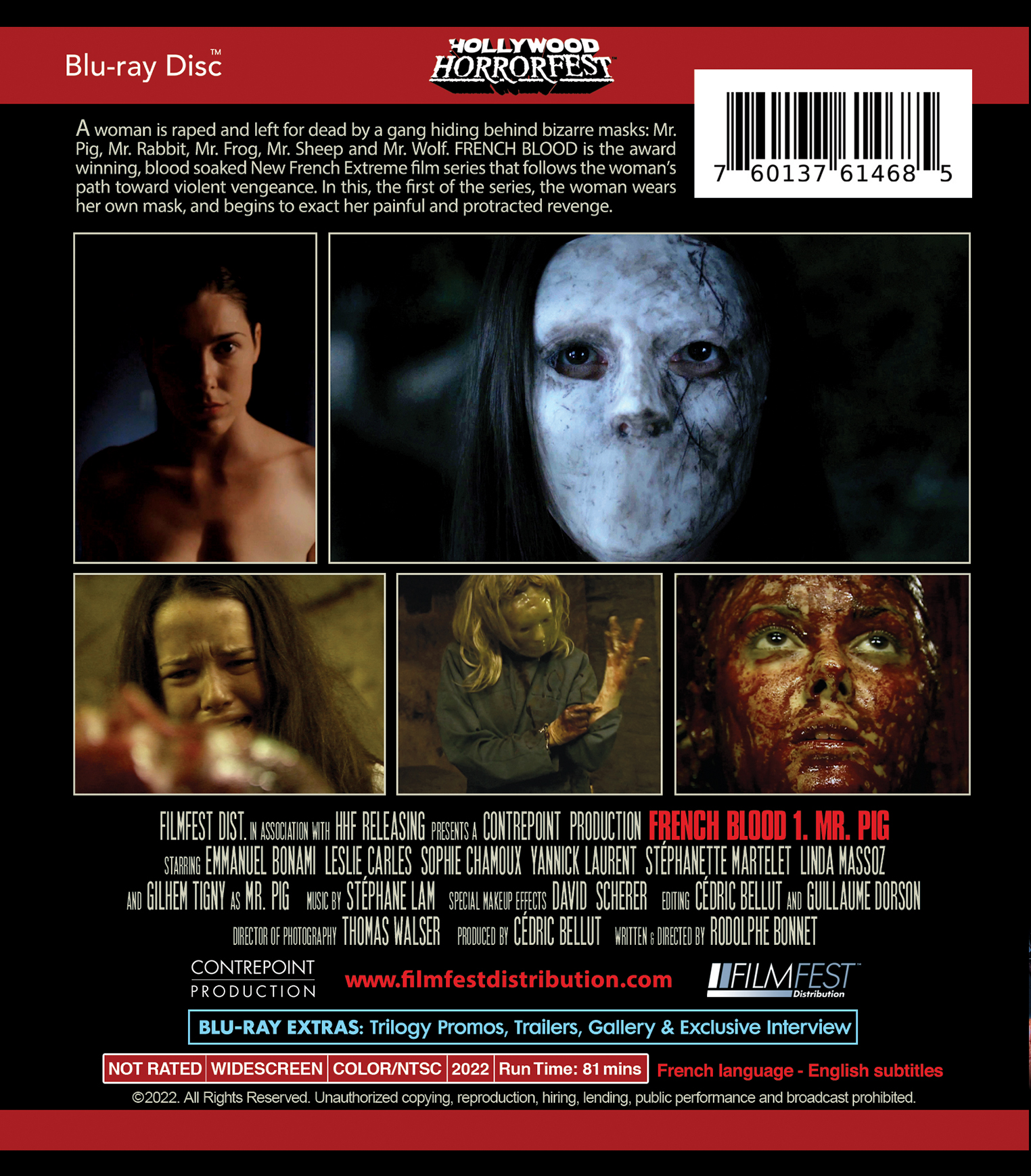 A woman is raped and left for dead by a gang hiding behind bizarre masks: Mr. Pig, Mr. Rabbit, Mr. Frog, Mr. Sheep and Mr. Wolf. FRENCH BLOOD is the award winning, blood- soaked New French Extreme film series that follows the woman's path toward violent vengeance. In this, the first of the series, the woman wears her own mask and begins to exact her painful and protracted revenge.