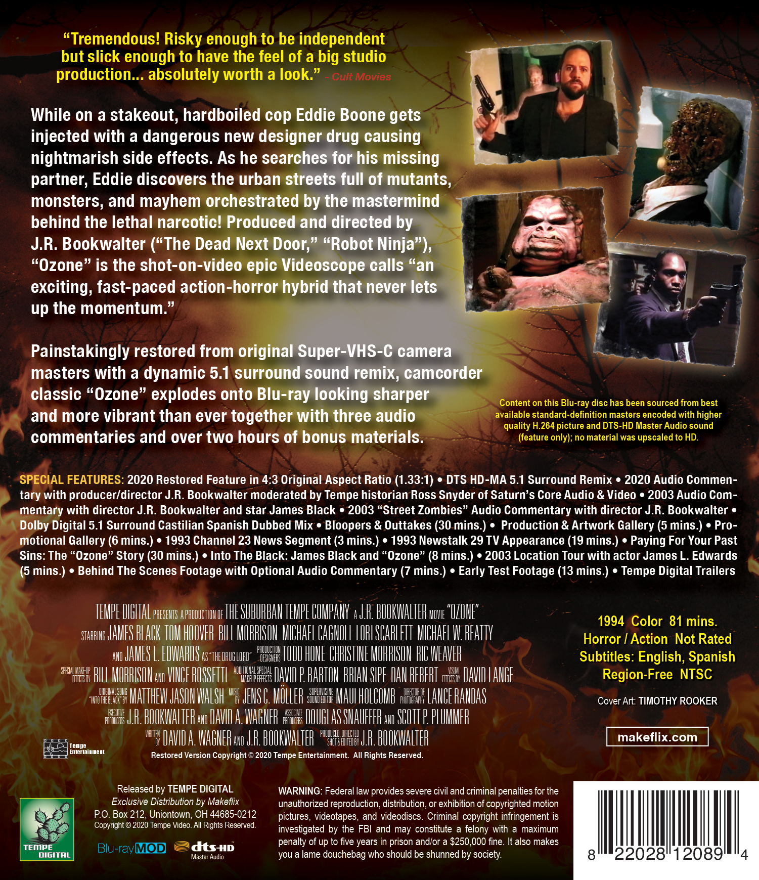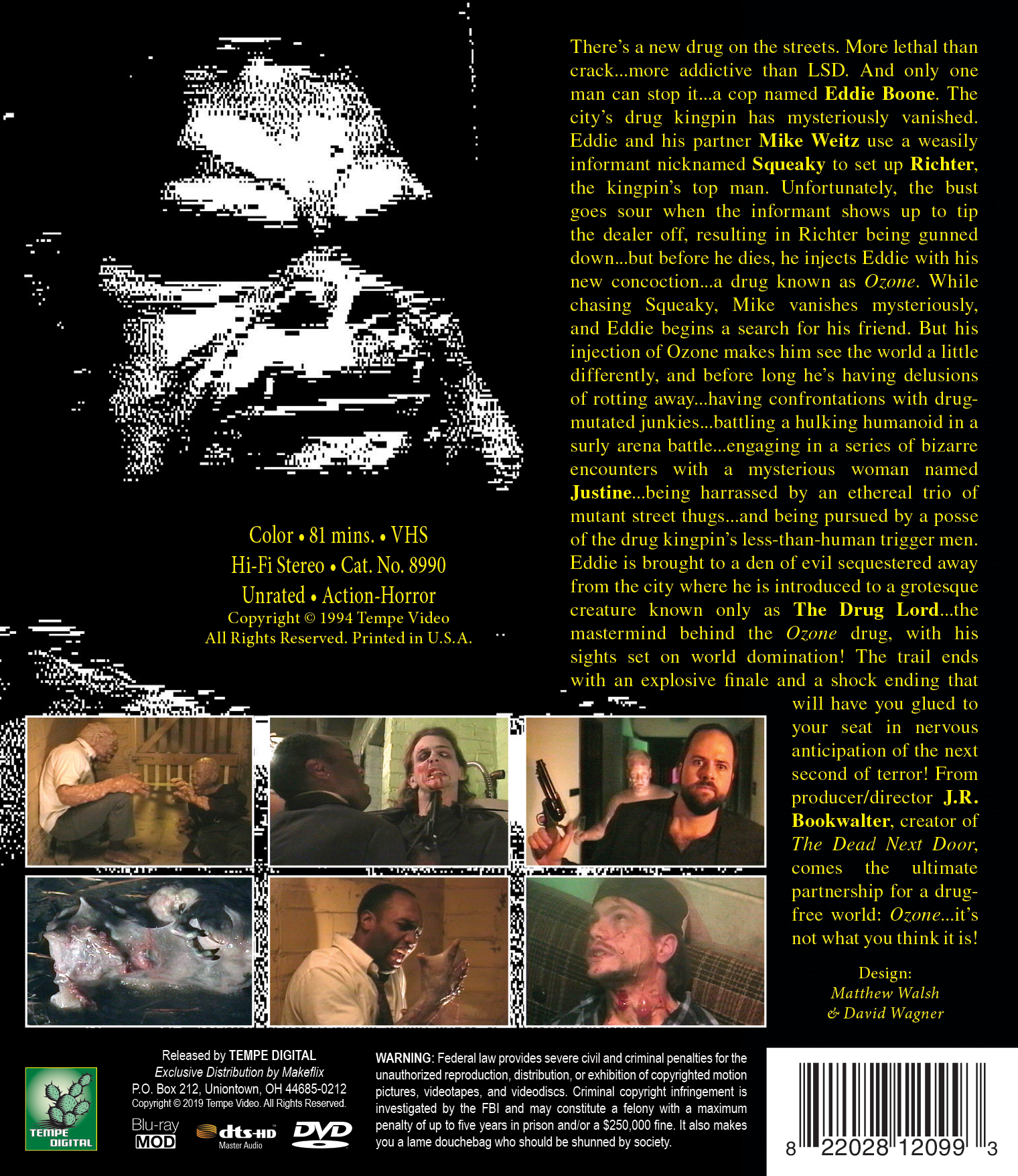 While on a stakeout, hardboiled cop Eddie Boone gets injected with a dangerous new designer drug causing nightmarish side effects. As he searches for his missing partner, Eddie discovers the urban streets full of mutants, monsters, and mayhem orchestrated by the mastermind behind the lethal narcotic! Produced and directed by J.R. Bookwalter (“The Dead Next Door,” “Robot Ninja”), “Ozone” is the shot-on-video epic Videoscope calls “an exciting, fast-paced action-horror hybrid that never lets up the momentum.”