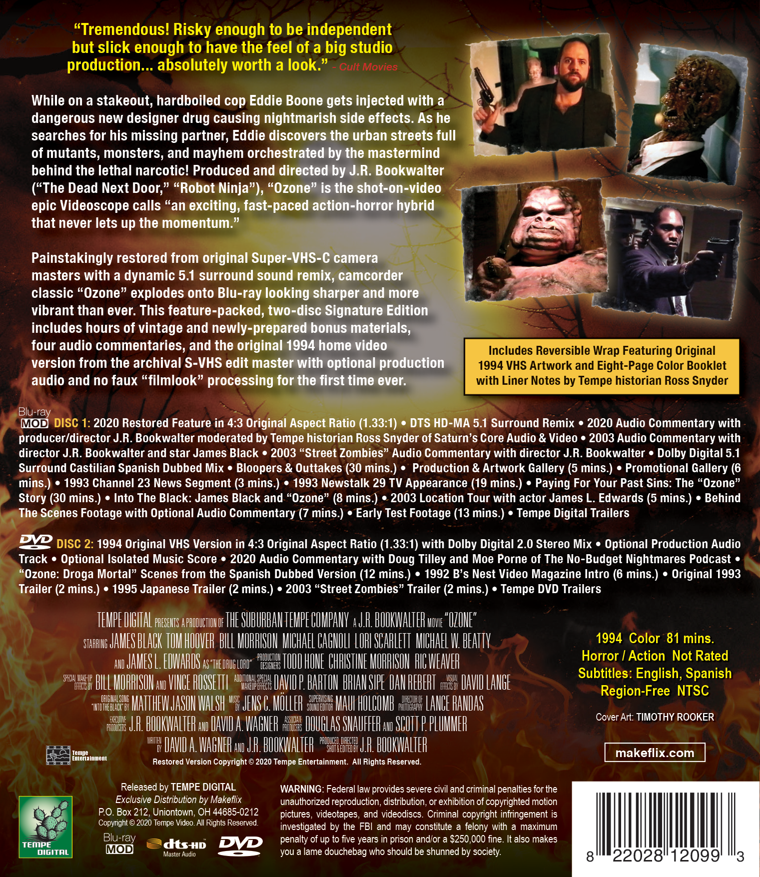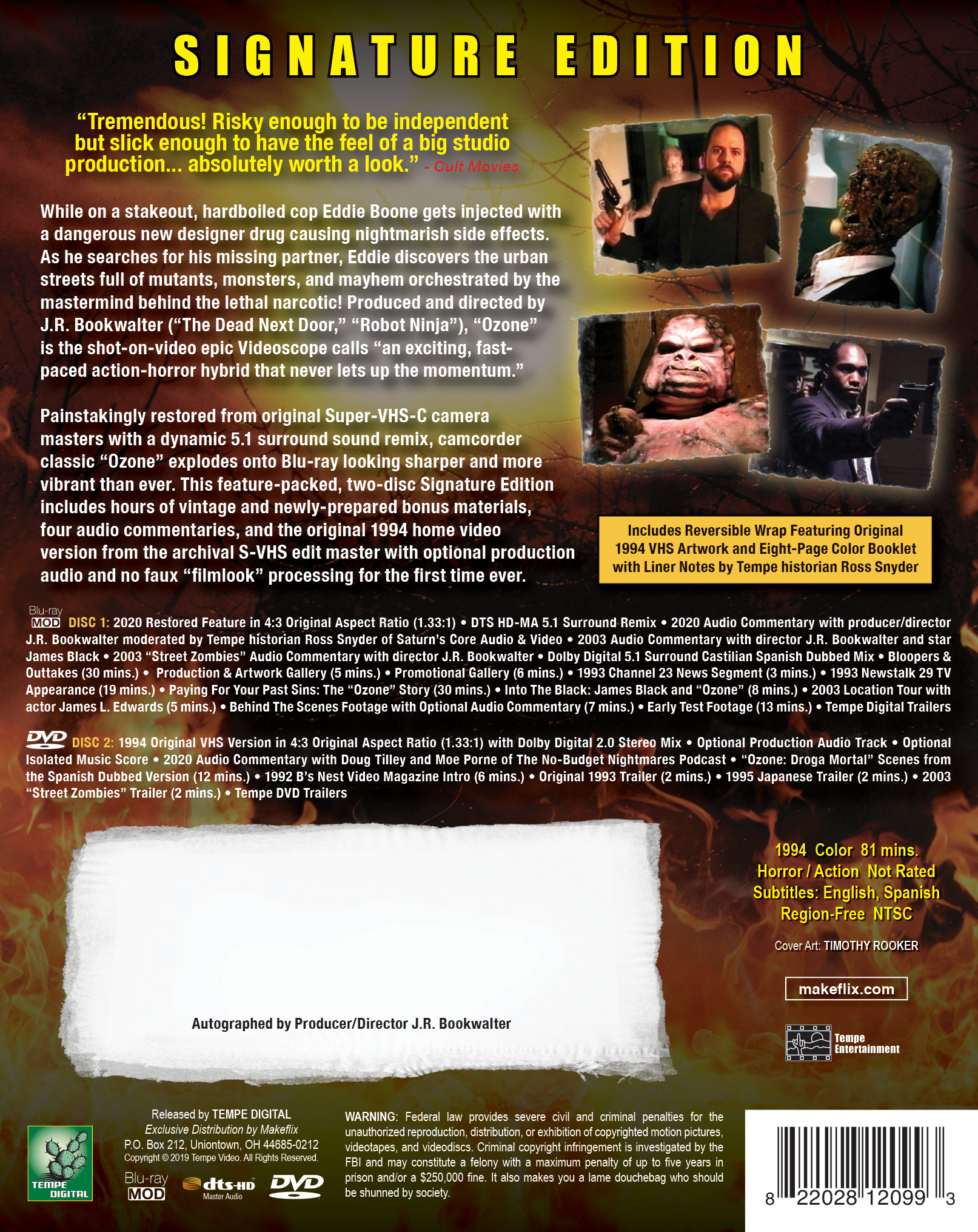 The feature-packed, two-disc "Ozone" Signature Edition includes hours of vintage and newly-prepared bonus materials, four audio commentaries, the original 1994 home video version from the archival S-VHS edit master with optional production audio and no faux “filmlook” processing for the first time ever, plus collectible reversible artwork, eight-page booklet, and autographed slipcover!