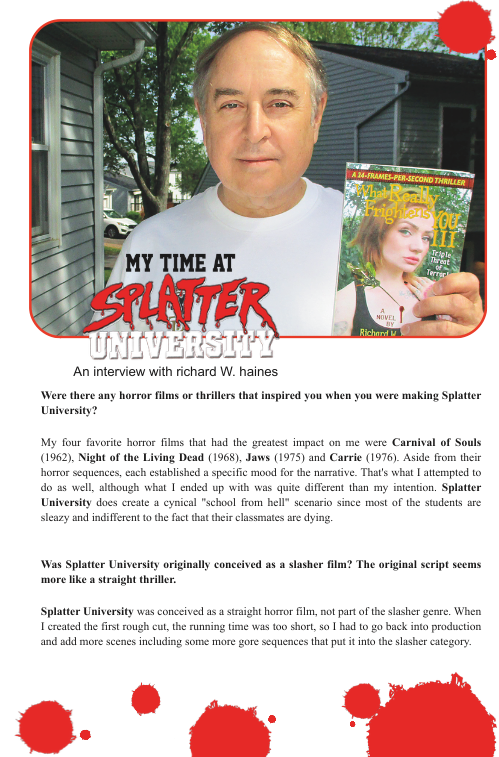 Who will graduate and what will be left of them? "Splatter University" was released in the final year of what horror fans fondly recall as the 'Golden Age of the Slasher Movie' (1978 to 1984). The Splatter University Yearbook delves into the making of the independent horror hit that has been shocking audiences for 40 years. Illustrated with archival materials courtesy of writer-director Richard W. Haines, and featuring an all-new interview with the filmmaker, Yearbook explores the film from its pre-production to release. Presented in blood-dripping color, The Splatter University Yearbook celebrates independent filmmaking at a time when twisted maniacs chased screaming coeds across mall cineplex, drive-in and grindhouse movie screens before showing up in video shops all over the world. Celebrate the 40th Anniversary of "Splatter University" with this unique look back at the gory glory days of slasher movies. (60 pages, 6" x 8")